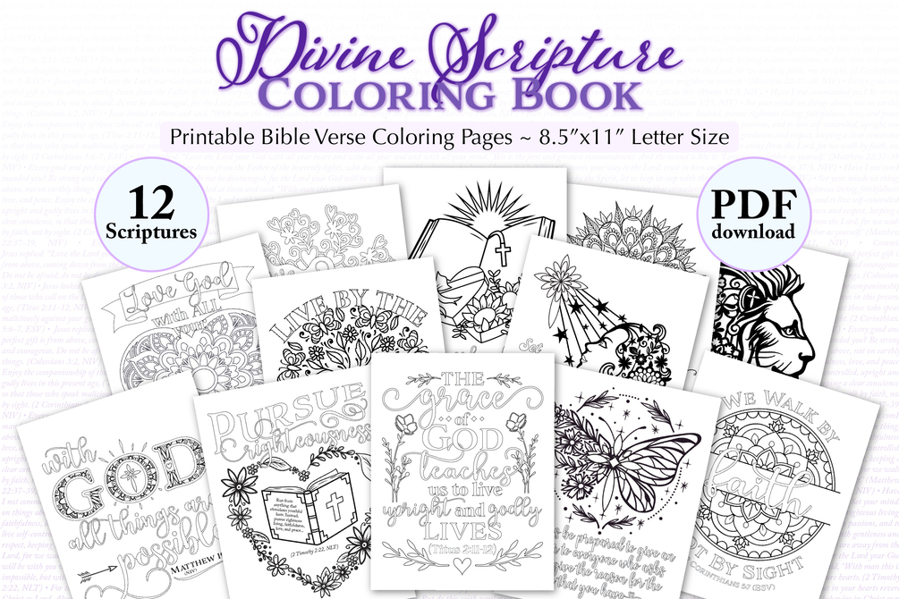 Divine Scripture Coloring Book ~ 12 Bible Verse Coloring Pages for Adults