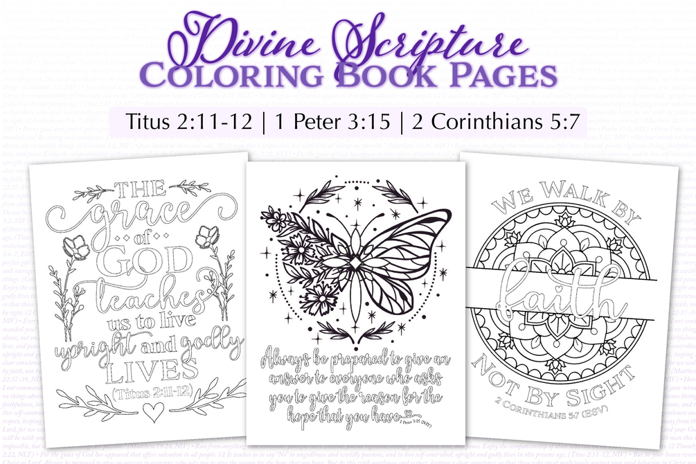 🎨 The Divine Scripture Coloring Book includes 12 Bible verse coloring pages. Scriptures are from a variety of different Old Testament and New Testament books, and cover a variety of Biblical topics such as love, faith, right living, and sharing the Good News. This is great printable coloring book for teen and adult believers ages ~12 and up, to help meditate on the Scriptures and commit them to memory!