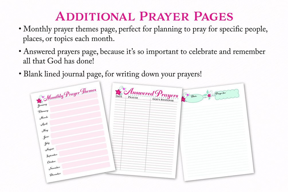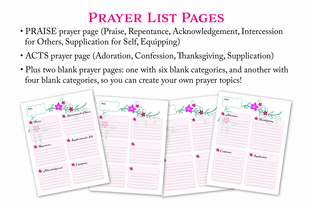 This "Garden of Life" floral prayer design includes a beautiful cover + seven printable pages you can use to make your own custom prayer journal: