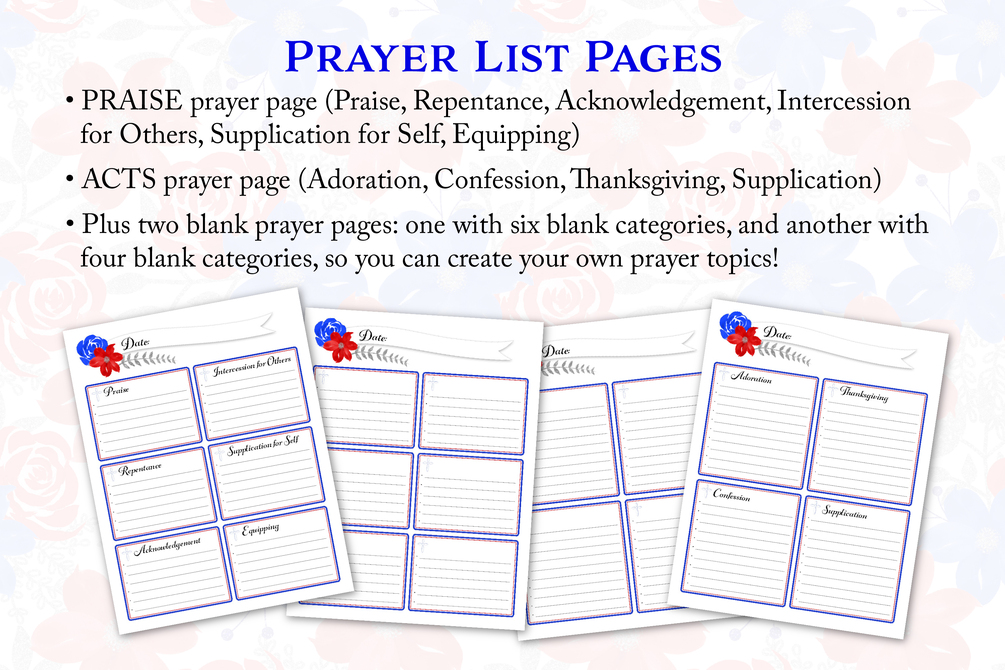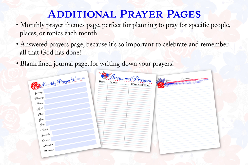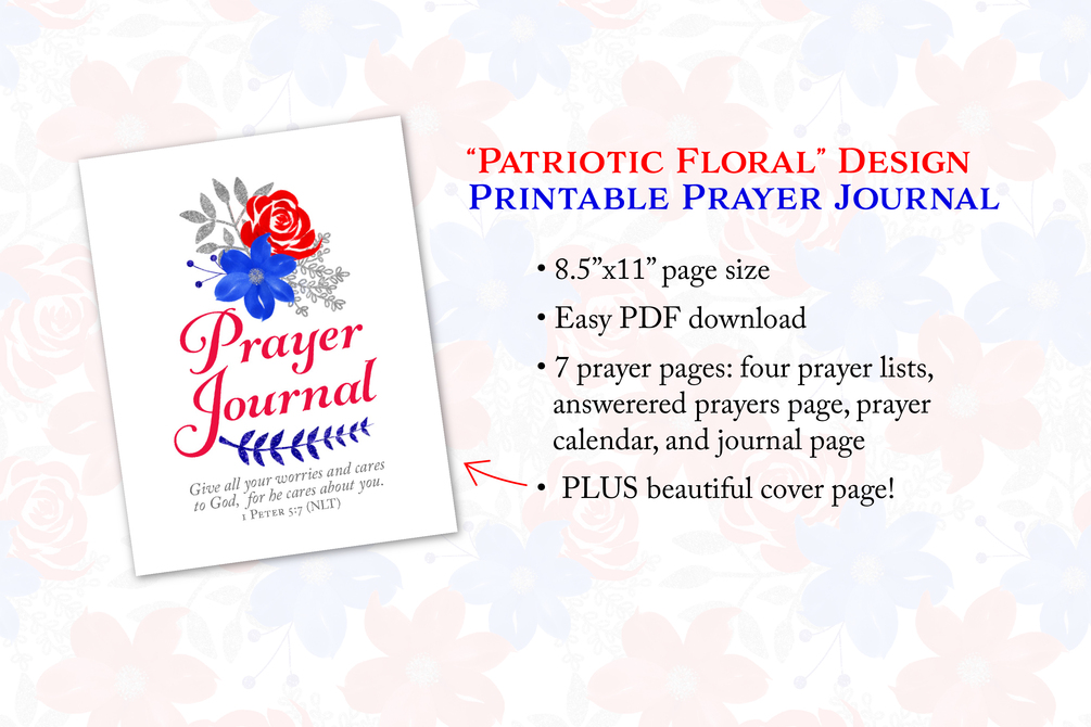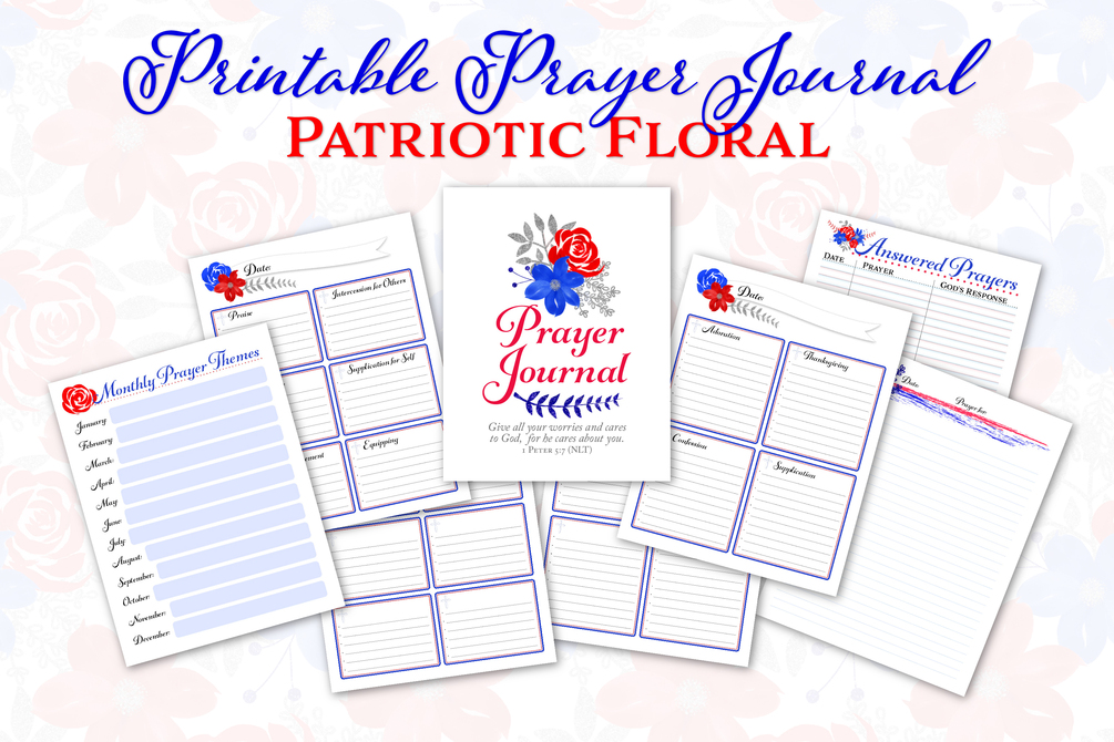 This "Patriotic Floral" blue and red prayer design includes a beautiful cover + seven printable pages you can use to make your own custom prayer journal: